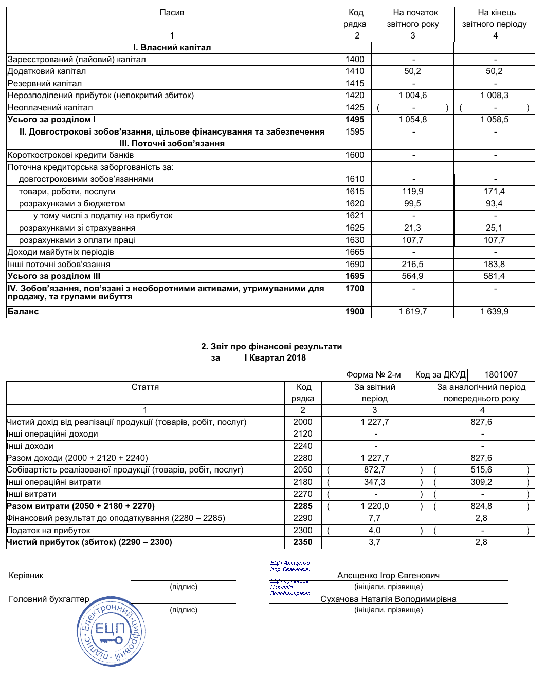 2018 1кв. 1-м, 2-м. Фінансовий звіт суб’єкта малого підприємництва