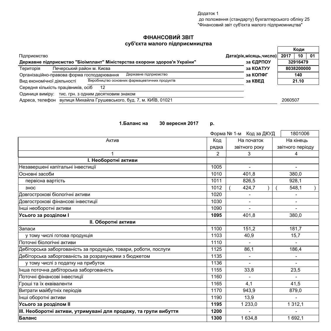 Financial reporting of SE "Bioimplant" Ministry of Health of Ukraine"