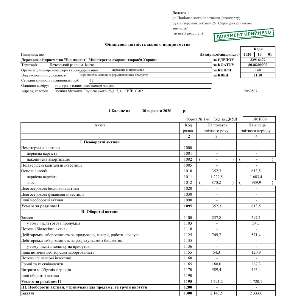 Financial reporting of SE "Bioimplant" Ministry of Health of Ukraine"